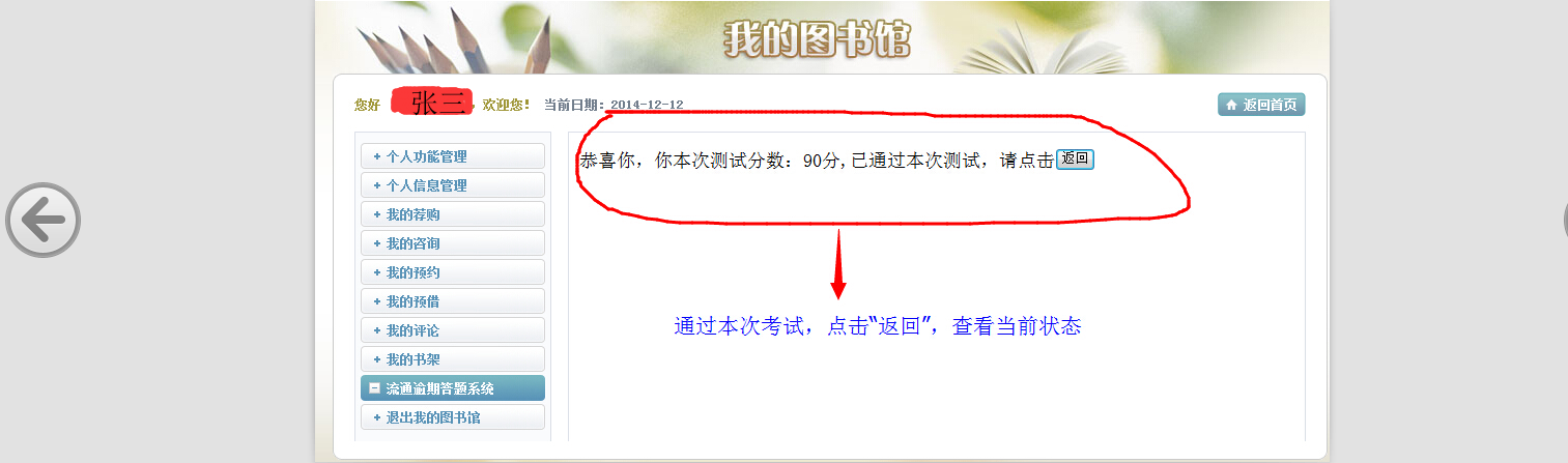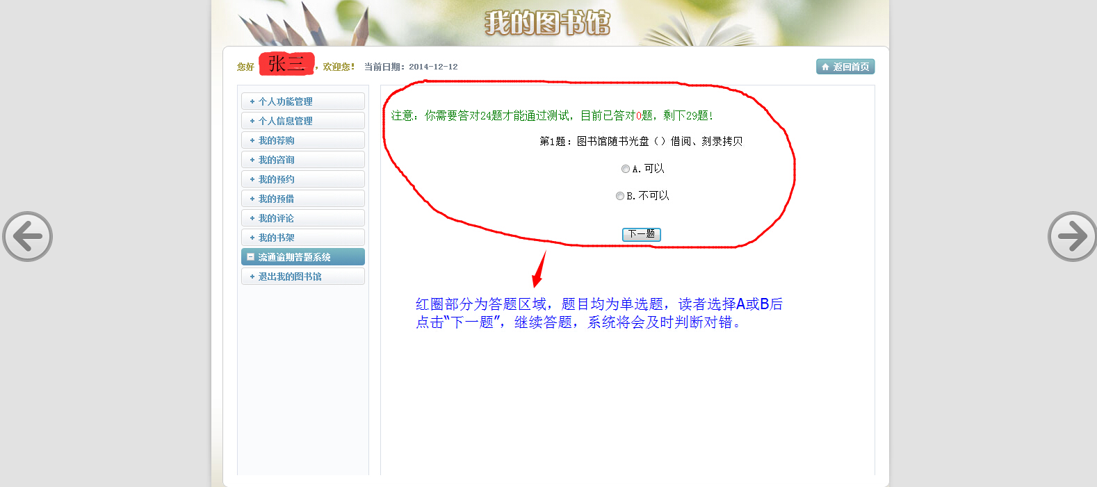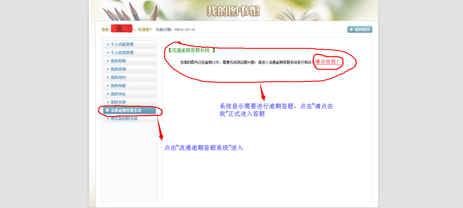 (二)如果读者还有未还逾期图书,请先到流通中心归还逾期图书,才能进行答题考试;