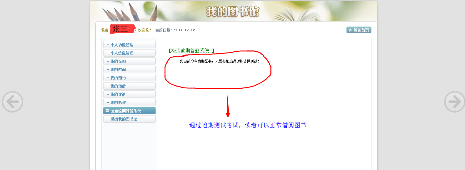 六、通过答题考试后,系统显示无需参加答题测试,读者恢复借阅,如下图: