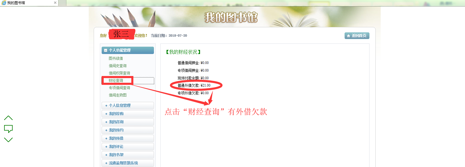 (一)如果读者在“个人功能管理”里面的“财经查询”发现有普通外借欠款,请进入“流通逾期答题系统”,通过测试后,欠款会自动取消,如下图: