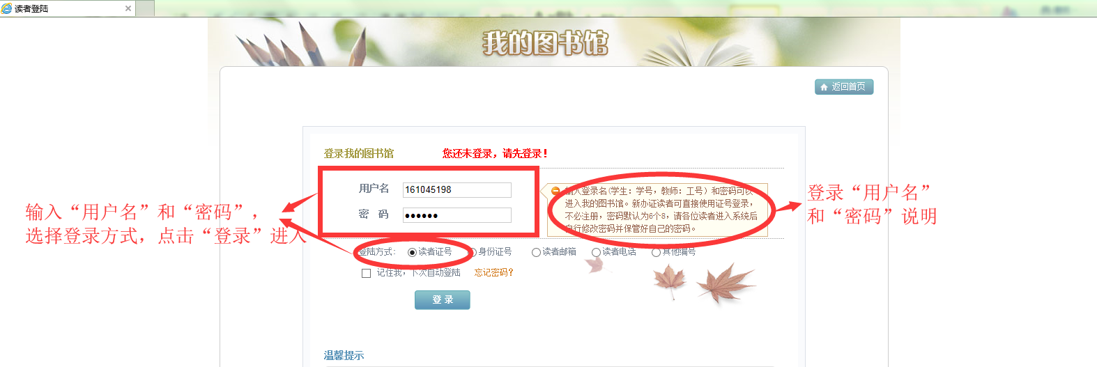 二、读者输入个人用户名(学生:学号,教师:工号)、密码登入系统,如下图: