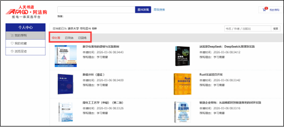 4、我的荐购:【个人中心】→【我的荐购】中可查看到所有的荐购书目,及图书馆的采纳情况。
