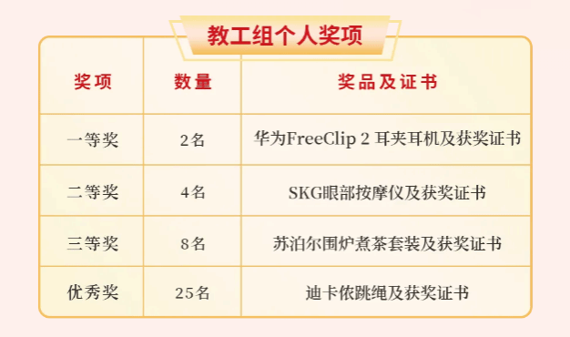 4.本次竞赛最终评出教工组个人奖项一等奖2名、二等奖4名、三等奖8名、优秀奖25名;学生组个人奖项一等奖3名、二等奖6名、三等奖9名、优秀奖35名。